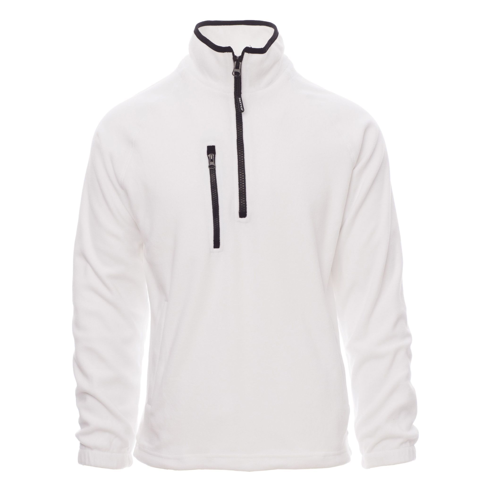 Fleecepullover mit kurzem, schwarzem 8 mm Reißverschluss aus Kunststoff, Raglanärmeln, regulierbarem Kordelzug in der Taille, elastischen Ärmelbündchen, zwei Taschen mit verdecktem Reißverschluss, einer Vordertasche mit Reißverschluss, Kragen mit verstärktem Rand in Kontrastfarbe, verstärkten Nähten.