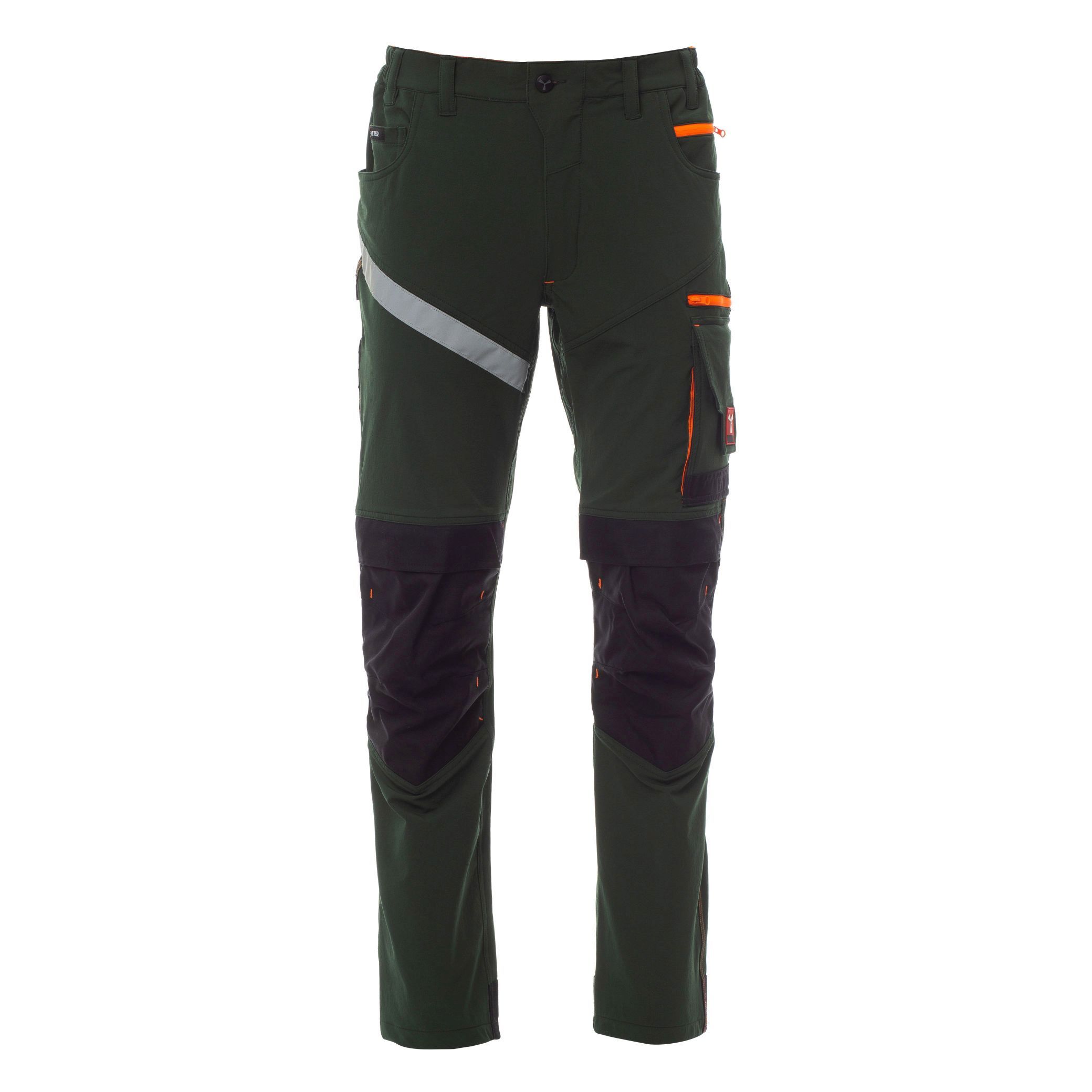 Unisex-Sommerhose, 4-Way-Stretch, seitlicher Gummizug und Gürtelschlaufen, Hosenschlitz mit Reißverschluss, personalisierter Knopf. Auf der Vorderseite 2 abgerundete Taschen, 1 Münztäschchen auf der rechten Seite und 1 Sicherheitstasche mit Reißverschluss auf der linken Seite. Auf der Vorderseite des linken Beins befinden sich 3 Taschen: 1 waagrechte Tasche mit Reißverschluss, 1 Tasche mit geformter Patte, Klettverschluss und Ausweisfach, 1 kleine senkrechte Tasche mit Reißverschluss. Reflektierender Streifen auf der Vorderseite des rechten Beins. Die Kniepolstertaschen an beiden Beinen werden von oben geöffnet. Rückseite: 1 Tasche mit Patte und Klettverschluss und 1 Tasche ohne Patte, aber mit 2 reflektierenden Streifen, 1 Hammerschlaufe (rechtes Bein), 1 offene Zollstocktasche (rechtes Bein) und 1 Handytasche mit Patte und Klettverschluss (rechtes Bein), reflektierende Einsätze auf Kniehöhe (beide Beine), Stoßband in Kontrastfarbe (beide Beine). Außerdem seitliche Nähte und Quernähte zur Verstärkung an verschiedenen Stellen in Kontrastfarbe. Die mittleren (italienischen) Größen 48-50-52 besitzen eine reguläre Innenbeinlänge von 82 cm.