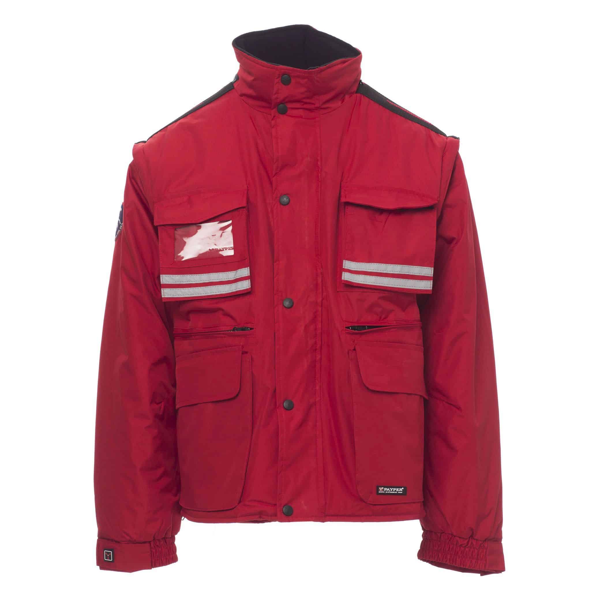 Herren-Jacke, abtrennbare Ärmel, verdeckter 8 mm Reißverschluss aus Kunststoff mit Metallschieber und Kunststoffknöpfen, vorgeformte, abtrennbare oder im Kragen einrollbare Kapuze, regulierbare Ärmelbündchen, graue Reflexstreifen vorne und hinten, vorgeformte Ellbogen und Seitenschlitz mit Ziehharmonikafalte und Reißverschluss, 9 Außentaschen, davon 2 mit LOCK SYSTEM, 2 mit Reißverschluss und verstärkter Innenseite, 1 mit nach innen wendbarem Ausweisfach. Innenseite: wattiert, Kragen, Rücken- und Nierenschutz aus Mikrofleece, atmungsaktive Einsätze unter den Armen, Kordelzug in der Taille und Innenreißverschluss zum einfacheren Veredeln mit Druck und Stick.