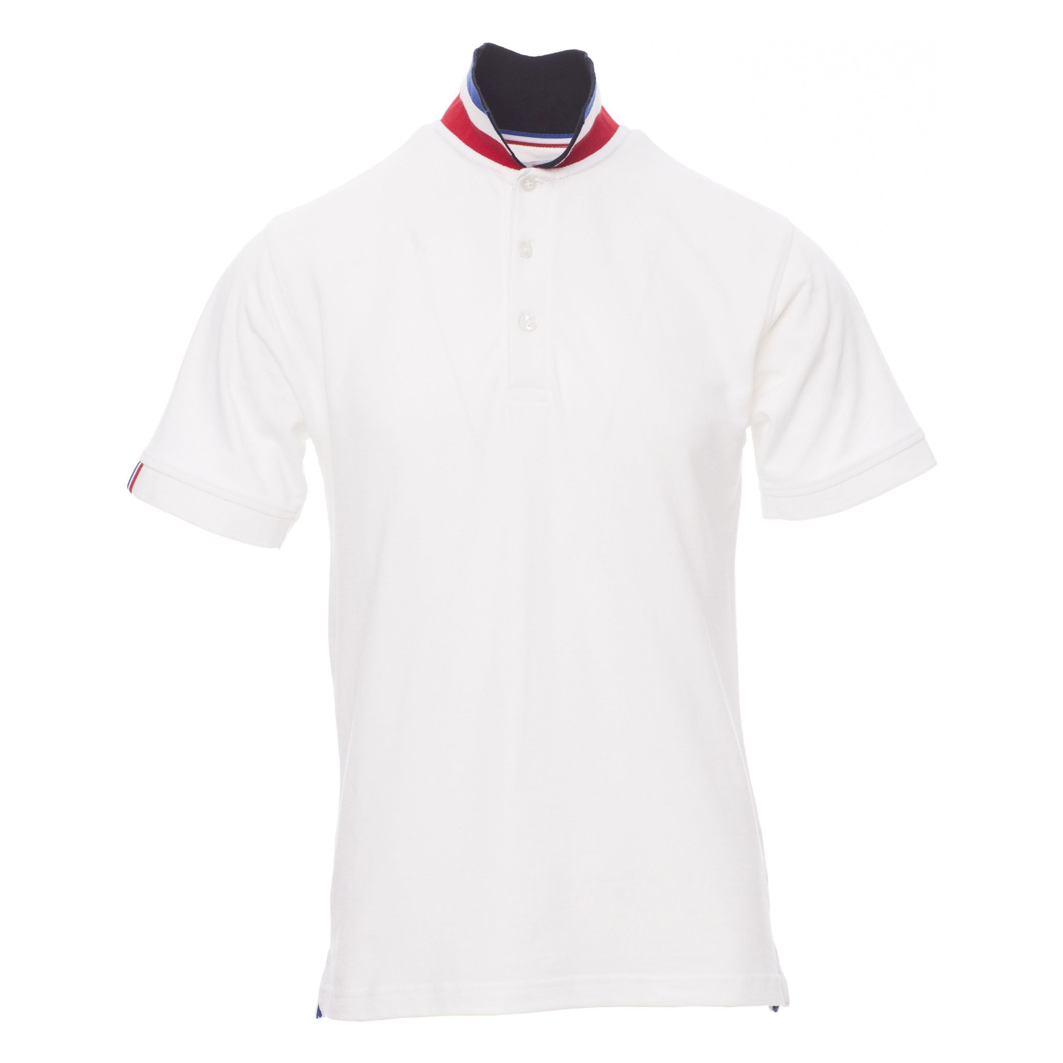 Herren-Poloshirt, kurzärmelig, mit 3 Knöpfen Ton-in-Ton und Perlmutteffekt, Oberseite des Kragens Ton-in-Ton, Unterseite mit den Farben internationaler Flaggen, die nur bei aufgestelltem Kragen sichtbar sind, mit dezentem Einsatz in den Farben der Flagge am rechten Ärmelrand, Kragen und Ärmelrand aus Feinripp, Seitenschlitzen mit den Flaggenfarben, Nackenband aus Jersey in den Flaggenfarben, seitlichem Verstärkungsband, Nackensattel.