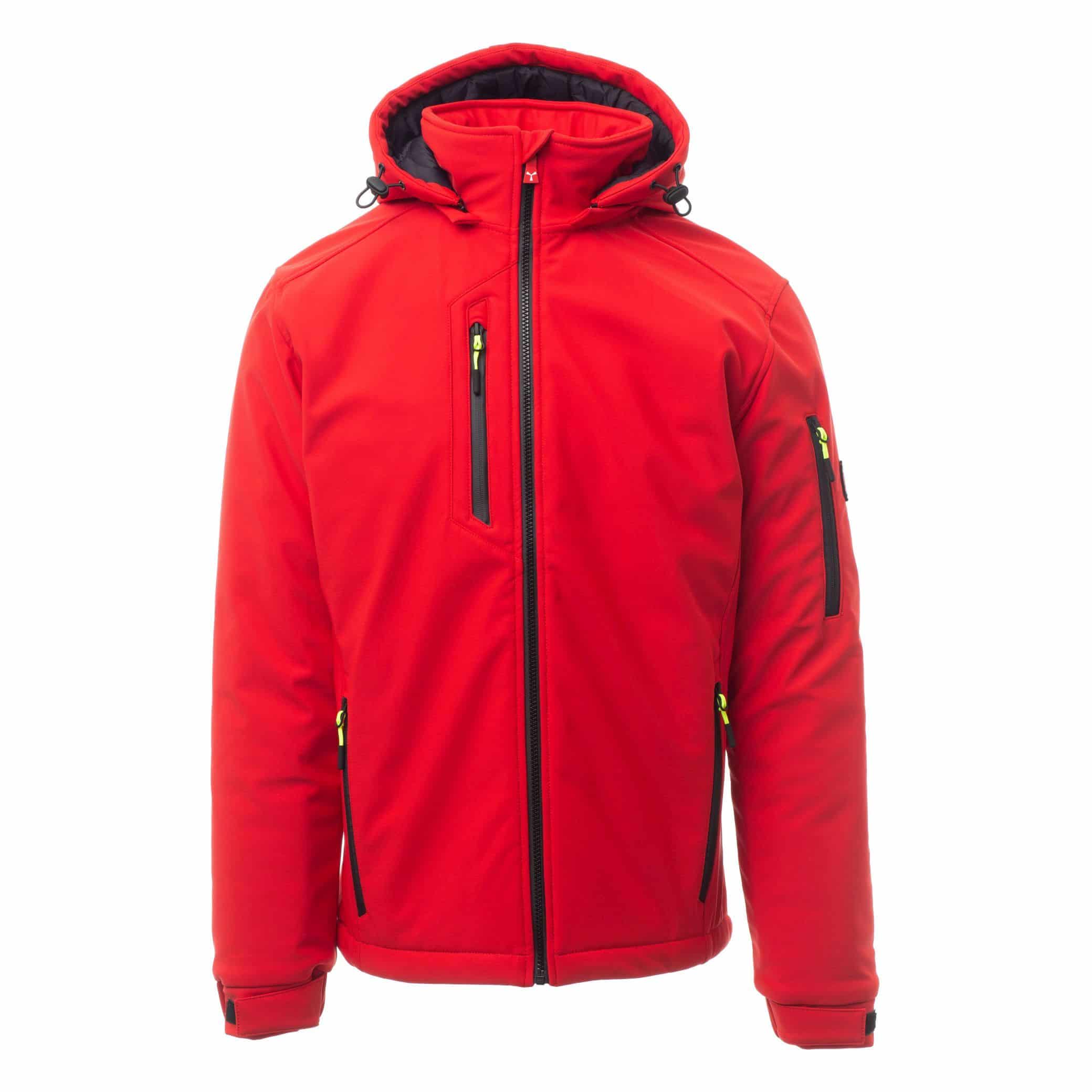 WP 8000 mm H₂O, MVP 5000 g/m² 24 h. Wattierte Herren-Softshell, SBS-Reißverschluss mit „Semi-Auto-Lock“-Metallschieber und personalisiertem Schiebergriff. Abtrennbare Kapuze mit regulierbarem Kordelzug. Innenkragen mit seitlichen Fleeceeinsätzen. Reflexstreifen hinten über der Taille und auf der Rückseite der Kapuze. Elastische Ärmelbündchen mit Klettverschluss zur Weitenregulierung. 2 Seitentaschen mit Reißverschluss, 1 Brusttasche mit beschichtetem Reißverschluss und 1 Tasche mit Reißverschluss und integriertem Stifthalter auf dem linken Arm. Fluoreszierende Schiebergriffe. 1 Innentasche mit einfacher Paspel und Klettverschluss. Regulierbare Taille mit personalisierbaren Stoppern.